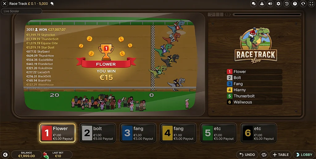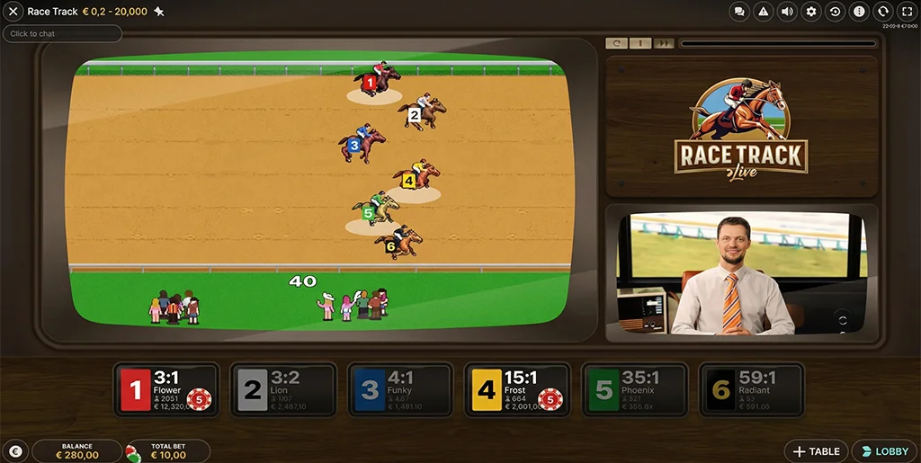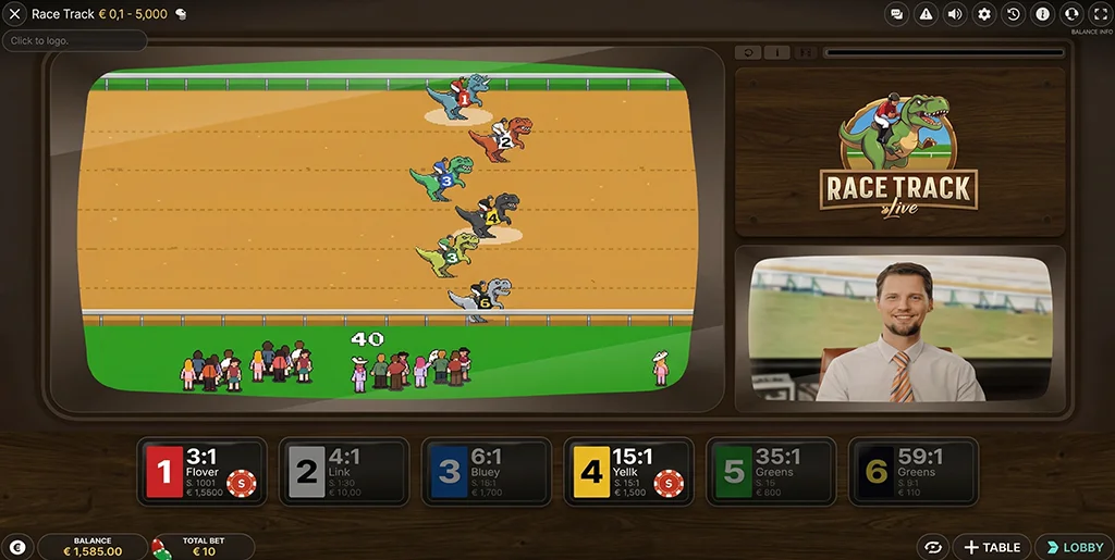 Evolution Race Track Live is an RNG racing game where six Horses or Dinosaurs compete against each other to win. Each of the six runners has odds of winning, and by using your judgement, you can bet on one, several or all of the runners in the race.