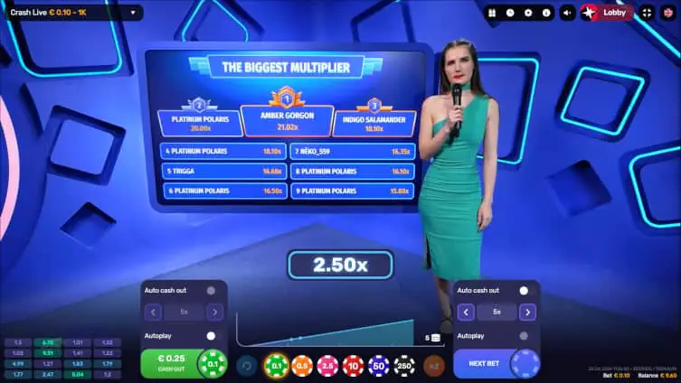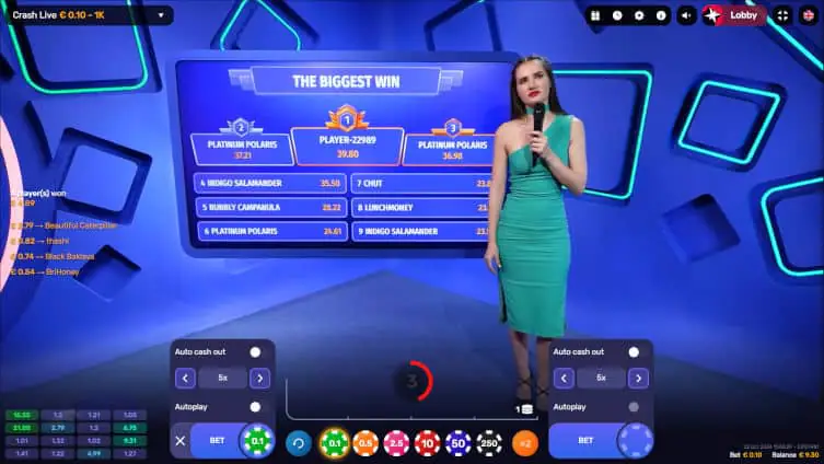 Crash Live mirrors games like Avaitor, the original crash game, but has a live presenter and a leaderboard so you can see how other players are doing.