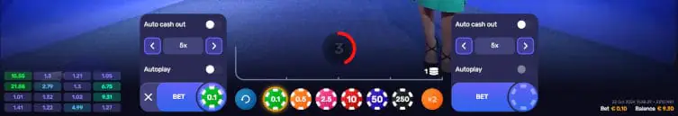 The playing interface has two betting positions, and you can set Auto cashout amounts for each bet. Autoplay allows you to repeat the bet for as long as you like, and it will continue until you cancel it or you run out of money!