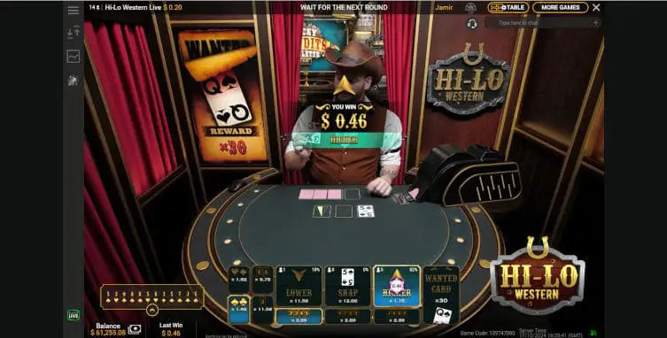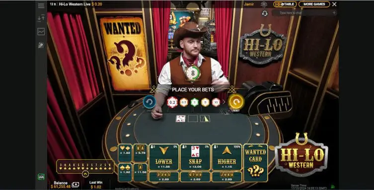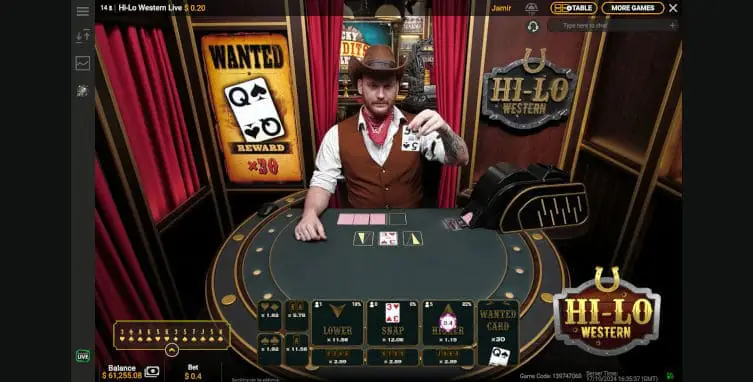Hi-Lo Western Live is an excellent upgrade from the original Hi-Lo Playtech, launched about seven years ago. Adding the Wanted Card, which gives a multiplier payout, is simple yet brings the game up to date as players have become accustomed to multiplier payouts.