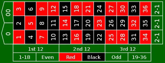 The American roulette wheel has an additional 0 called the 00 (double Zero), usually green.