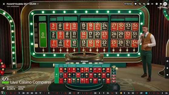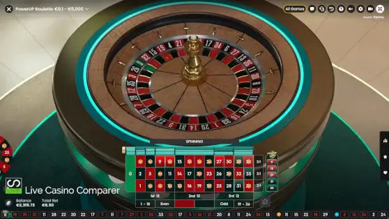 Along with Lightning, XXXTreme, Quantum, XL, Mega and SuperStake, PowerUP Roulette sits in the live casino roulette with multipliers category of live dealer games.