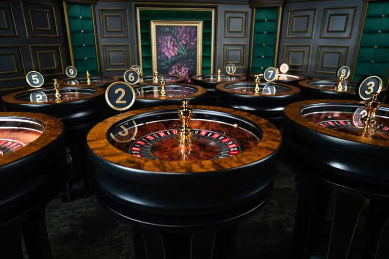 The 12 Auto Roulette wheels are laid out in a studio in three rows of four wheels. Each wheel is given a number, 1 thru to 12.