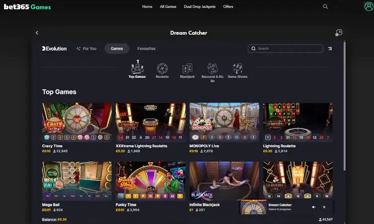 Traditionally a Playtech Live casino, bet365 has added a selection of the most popular games by live casino provider Evolution. It’s now possible to play Crazy Time and the Lightning range alongside popular Playtech games such as Adventures Beyond Wonderland.