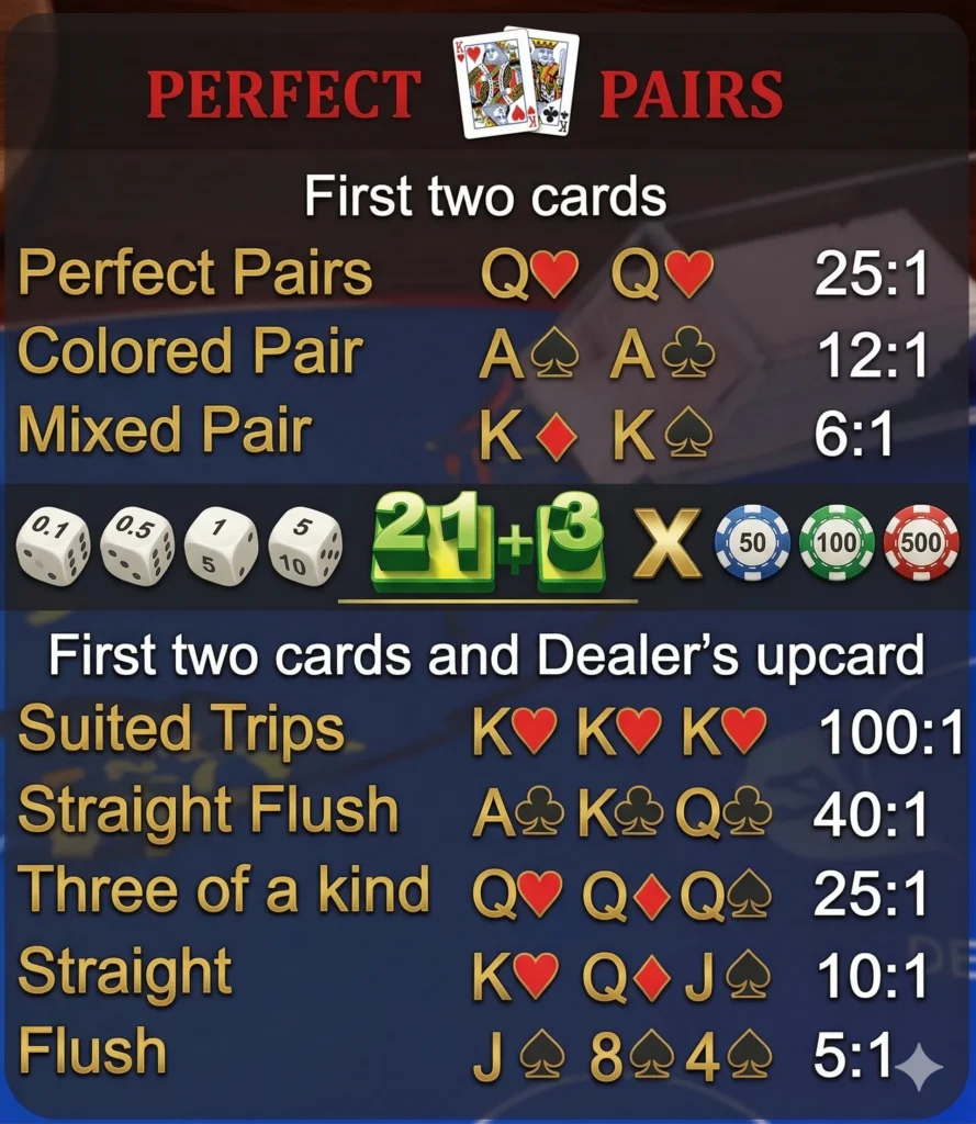 Perfect Pairs is a blackjack side bet that lets you bet on whether your first two cards will be a pair.