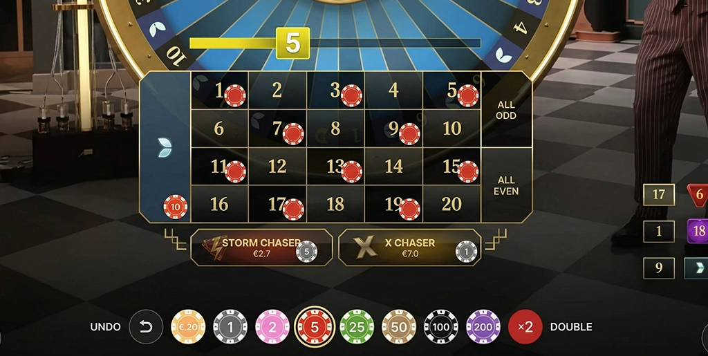 The X-chaser is a one-chip bet covering every number with a bonus round with a random multiplier. If you’ve already bet on the number, it will just add the two together. Again, this guarantees you have a bet on every bonus with a multiplier.