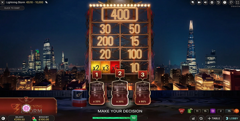 Lightning Storm is a big wheel gameshow with twenty instant wins and nineteen bonus segments distributed across the big Digiwheel. You have to predict the segment where the wheel will stop correctly. The instant wins pay 1:1, while the five bonus rounds can pay up to 20,000x. Random multipliers can boost the bonus round segments by between 2x and 50x, which leads to the wins reaching a staggering 20,000x.