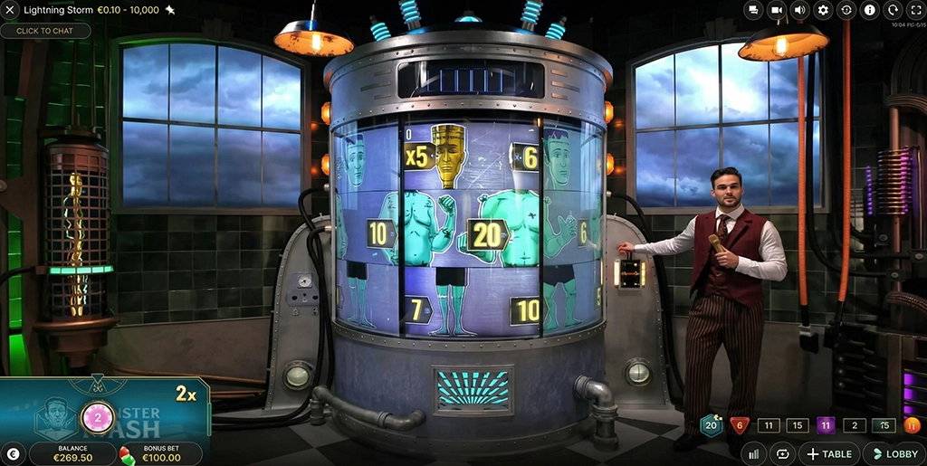 The game is set in a science laboratory where lightning is harnessed to power the experiments featured in the bonus rounds. Get lucky on the wheel to play the Hot Spot, Monster Mash, Battery Charger, Fireball and Lightning Storm Bonus Rounds.