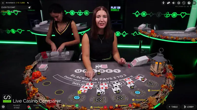 You can play Live Blackjack on a seven-seat table or on a specially adapted table where you're playing with lots of other people playing the same hand, known as Unlimited or Infinite Blackjack.