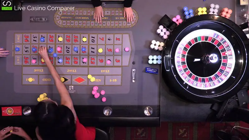All play is controlled by the croupier and the table is used as a normal table. Nothing special is done to accommodate online players.