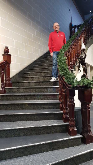 Cher at work with the staircase in the background 🙂