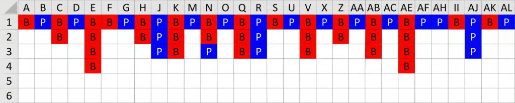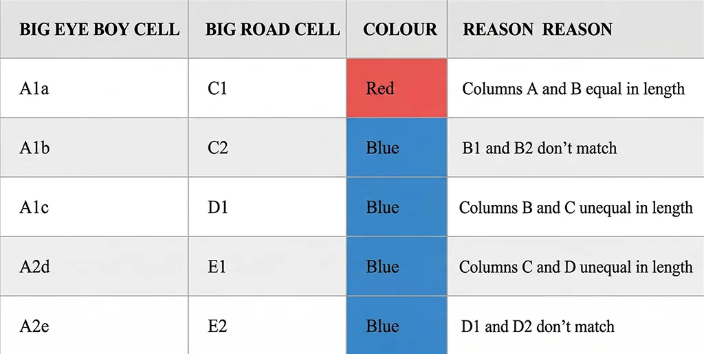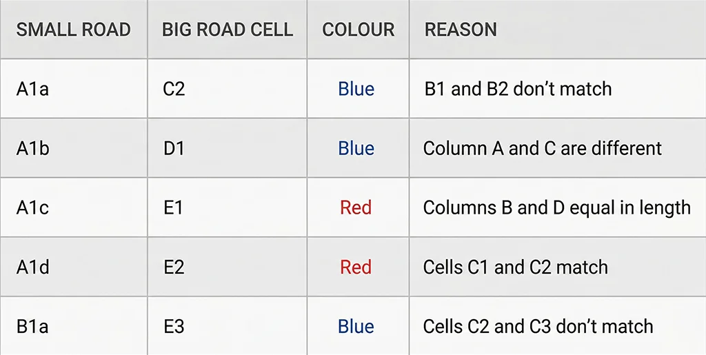 For example, the first entry shows cell A1 on the Big Eye Boy table. This corresponds to the same hand represented in cell C1 of the Big Road table. Since cell C1 is the beginning of a new column, we check if the previous two columns are equal in length. If they are we colour the Big Eye Boy red for cell A1. If the columns are different in length, it would be blue.