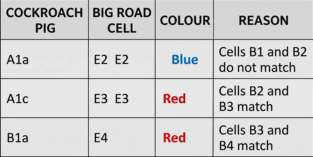 The next table is "Cockroach Road." The Cockroach works exactly like the Small Road, except it skips two columns to the left of the current column in the Big Road.