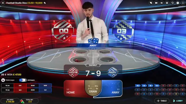 Football Studio Dice is a version of Evolution's card game Football Studio, which uses dice instead.