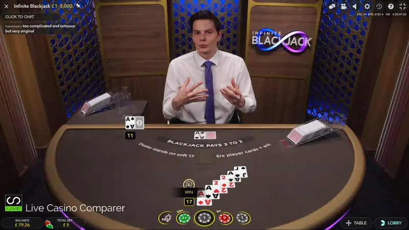 Infinite Blackjack is an Evolution blackjack table released in 2018 that’s played with 8 decks and has rather favourable rules. What’s unique about this game is that the player is always guaranteed a seat, as all players share the same two starting cards.