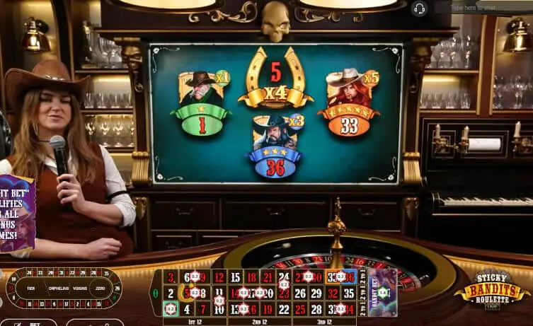 Sticky Bandits Roulette Live is a multiplier game with an optional Side Bet, which qualifies players for the Sticky Bandits Bonus Round.