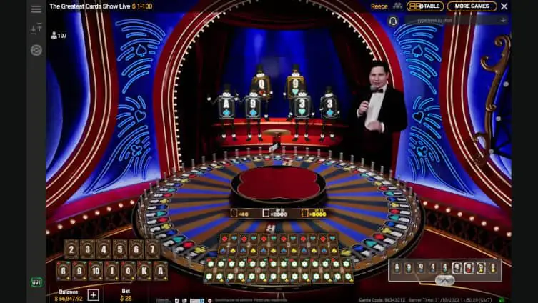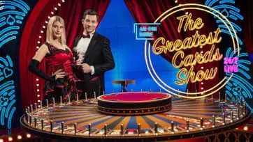 The Greatest Cards SHow is a live entertainment gameshow from Playtech. It uses a horizontally mounted wheel with the contents of a fifty-two-card deck of playing cards. Three RNG bonus rounds can deliver multiplier wins up to 5000x. The game's presentation is excellent, although the bonus rounds could be better.