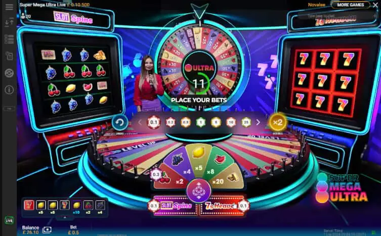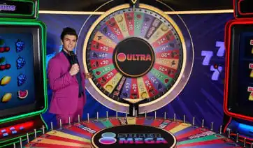 Super Mega Ultra Live is an exclusive game show produced for Bet365 by Playtech. It's a big wheel game with Two Bonus Rounds and a unique level-up feature, which boosts payouts and gives access to a second Ultra wheel for even bigger wins.