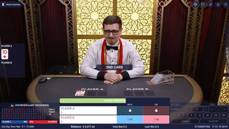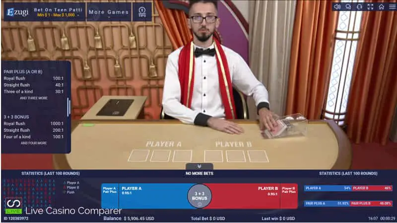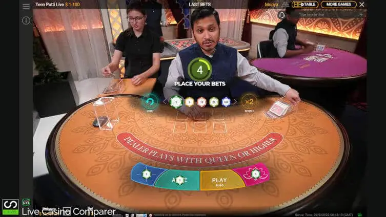 Ezugi were the first supplier to create a live dealer version of Teen Patti. In fact, they have two versions, Teen Patti and Bet on Teen Patti. The betting is slightly different between the two, and I prefer the original Teen Patti.