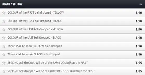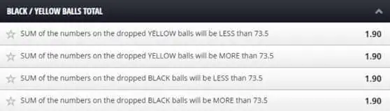 These bets are on whether the Black or Yellow balls are drawn will total above or below seventy-five.