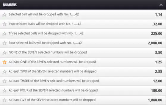 Lucky 7 is a lottery-type game, where seven balls are chosen at random from a selection of forty-two. It’s not just about picking numbers to be drawn, there are all sorts of betting options that don’t require you to select any numbers. This makes this a really fun game to play.