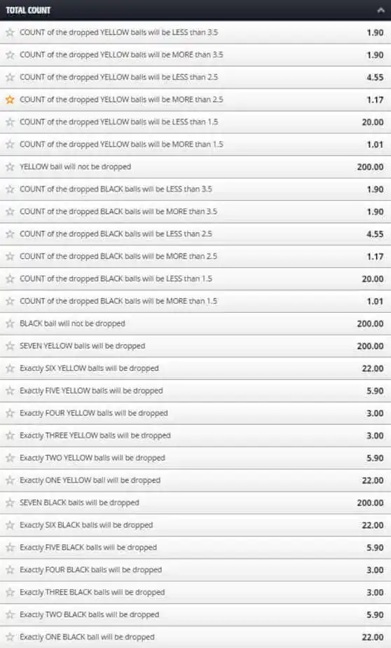 Total Count is about the number of balls drawn. Bets include the number of coloured balls being above or below a count and the specific number of coloured balls drawn.