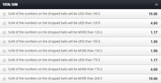 This bet is focused on the total sum of the balls dropped. You can bet on the sum being above or below specific totals. The higher the total the greater the payout.