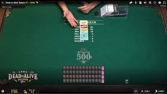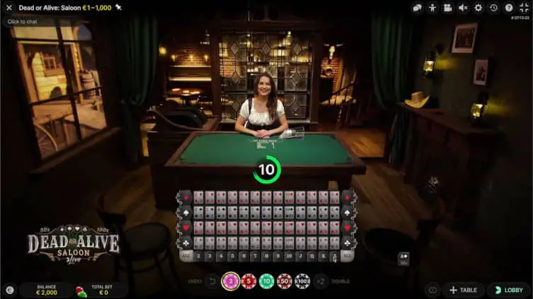 Dead Or Alive Saloon is a live dealer card game from Evolution. The game’s objective is to bet on which card in a deck of fifty-two the dealer will turn over first. The deck contains a multiplier and bonus cards, which can boost the final payouts by hundreds of x.