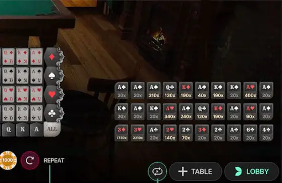 After selecting the wager amount, you click on the cards to place a bet: select single cards, the whole suit or all of one number, or a combination of them.