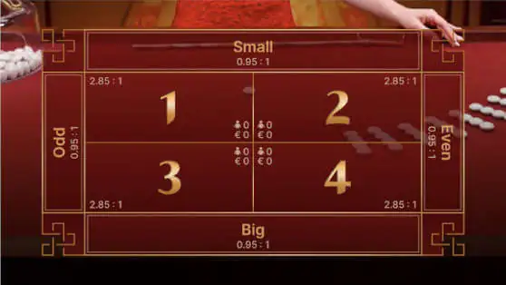 Bets can be placed on the number of beads remaining after the sorting process has been performed. In addition, it's possible to bet on whether that number will be odd or even.