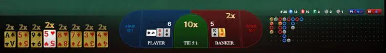 There are two playing positions, Banker Player, and three Side bet options, Banker and Player Pair and Tie.