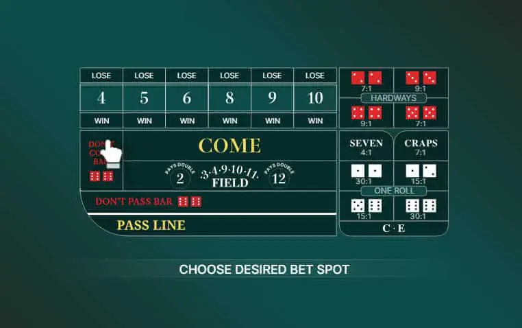 This is the opposite of the come bet. If the first roll is a 2 or 3 you win, 1:1. If the result is a 12 then it’s a push. When a 7 or 11 is rolled you lose. If either 4, 5, 6, 8, 9, or 10 is rolled this becomes a Point number. If a seven is rolled before the point then you win, if the point is rolled first you lose.