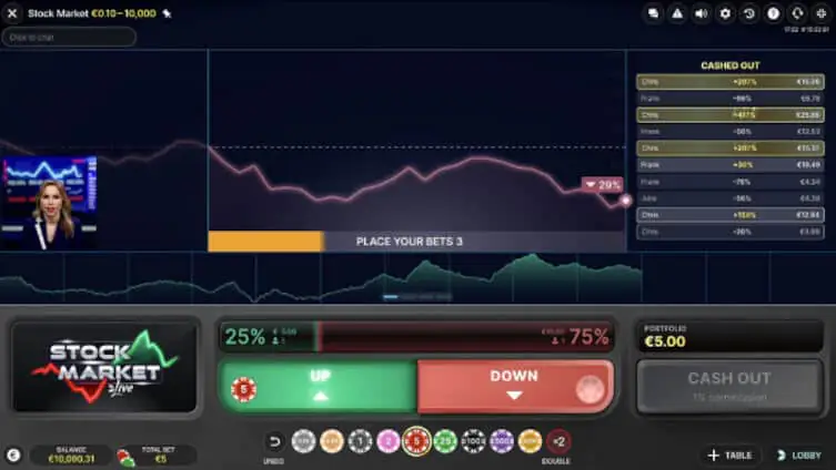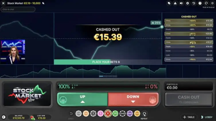 - Stock Market with a live video stream featuring a game host, but without automatically re-wagering the bet on the same bet spot. The game automatically cashes out the player's portfolio after each game round.