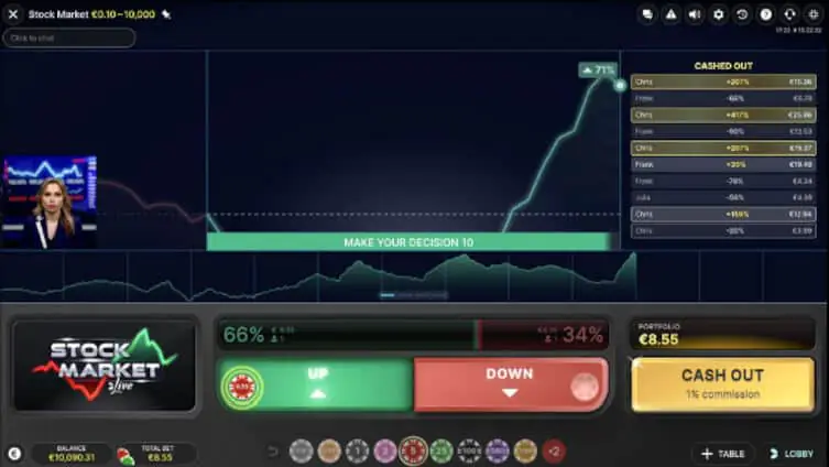 Evolution Stock Market Live is an elaborate coin toss gamble, presented as a sophisticated stock trading simulation game with fast-paced rounds.