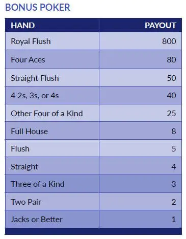 Bonus Poker is similar to Jacks or Better but offers increased payouts for certain four-of-a-kind hands.
