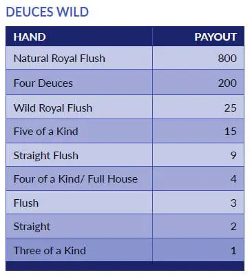 Double Double Bonus, with its big payouts, has an RTP of 98.80%, while Deuces Wild and Bonus Poker come in with 98.91% and 99.17%, respectively.