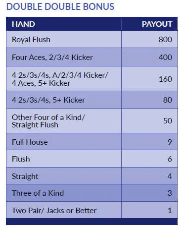 Double Double Bonus Poker is an enhanced version of Bonus Poker. It features even higher payouts for four-of-a-kind hands, mainly when they include Aces and high-ranking kickers (additional cards that accompany the four-of-a-kind).
