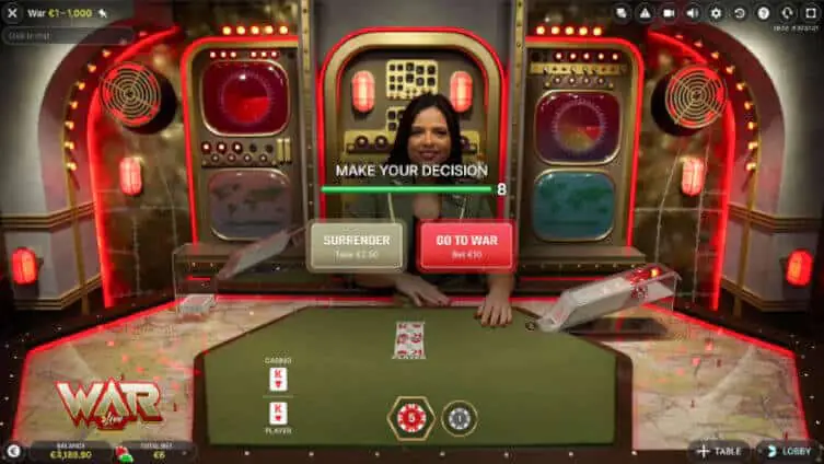 War Live is based on the original Casino War game but has a twist when the hand ends in a Tie. This triggers the decision to go to War, where you can surrender your hand for a 2.5:1 payout or double your bet for a showdown with the dealer.