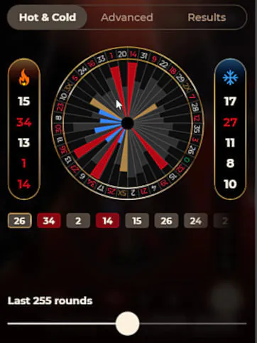 The Advanced results display the win percentages of each of the Inside and Outside bets, including the French Bets covering the wheel sections. There's a result slider to display the last 10 results up to the previous 500, and you can expect the percentages to change as you add or remove results. The more results showed, the more in line with the game RTP. The fewer results shown help identify trends.