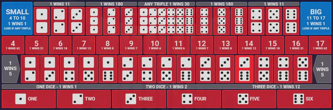 | Total | Where you're betting on the total of the 3 dice being a specific number. | 4 or 17 pays 62:1 5 or 16 pays 31:1 6 or 15 pays 18:1 7 or 14 pays 12:1 8 or 13 pays 8:1 9 or 12 pays 7:1 10 or 11 pays 6:1 |