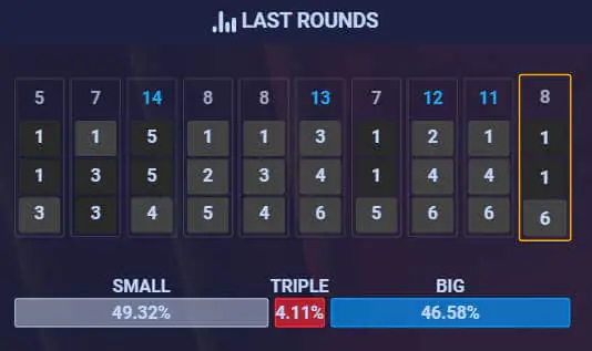 - The percentage of the rolls being Big or Small and also the percentage that Triples took.