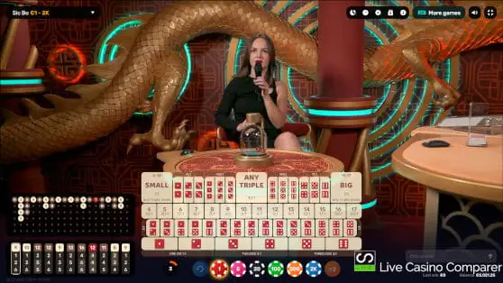 The dealer plays no active role in the game; they are there to comment on it and read the results. A timer controls the actions in the game. After betting time has closed, the dice shaker activates, which shakes for a few seconds before coming to rest. The top face of the three dice determines the result.