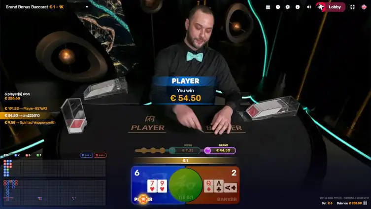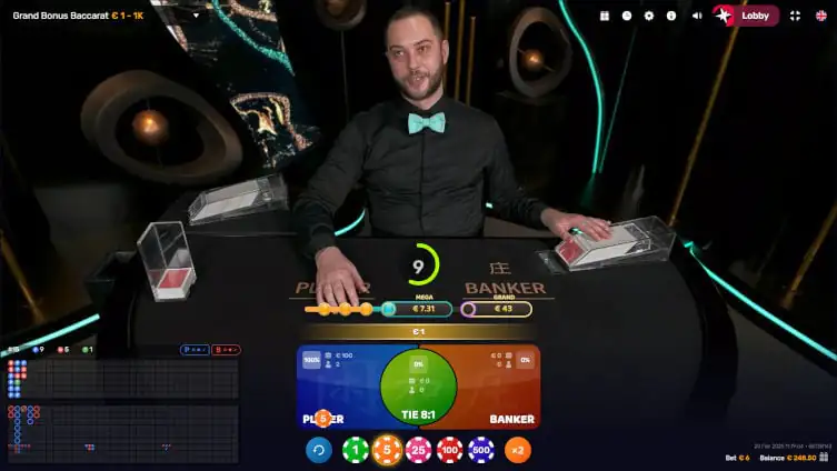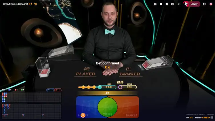 Grand Bonus Baccarat follows the theme of Baccarat games with Multipliers. We already have Lightning Baccarat, Golden Wealth, Peek and Prosperity Tree Baccarat from Evolution, Mega Baccarat from Pragmatic and Quantum Baccarat from Playtech. All of these give multipliers of different ranges with a 20% fee.