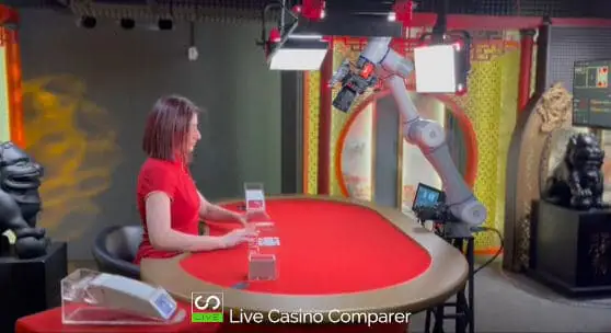 It was first introduced to hold a camera on the Gold Baccarat table. Rather than multiple cameras and angles, the camera is mounted on a robotic arm, which moves into the cards giving close-up images. This has several benefits, 1. There is no need for lots of cameras, 2. there is no need to use computer-generated images in the mobile playing interface - you can see the cards. 3. Reduces the use of camera jigs and cabling in the studios.