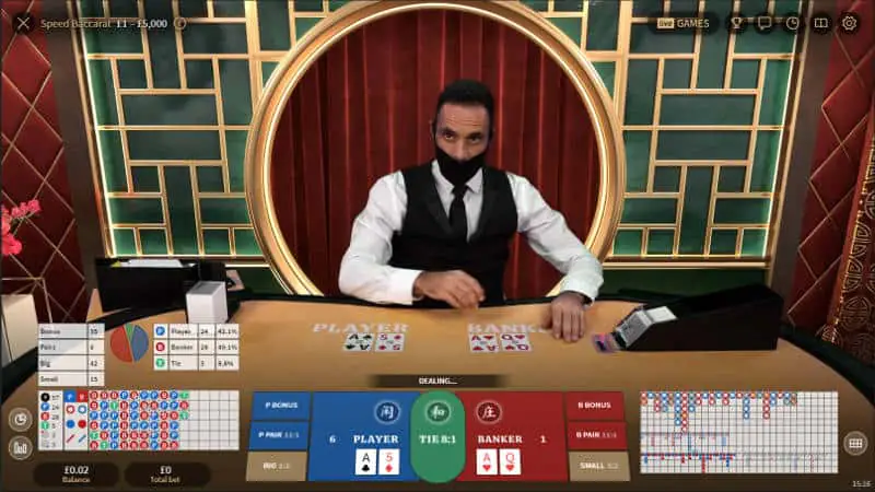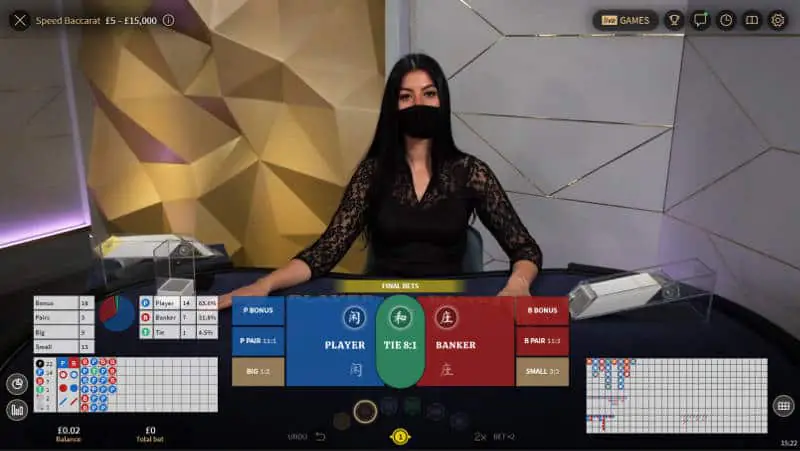 This online live dealer game is offered as NetEnt Speed Baccarat, where all the cards are dealt face up and in quick succession. It's not a game for the traditional baccarat player who is probably looking for a slower more considered game, where the cards and hands are revealed slowly, following local traditions.