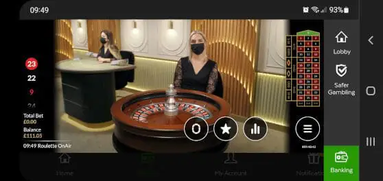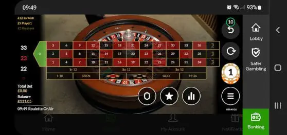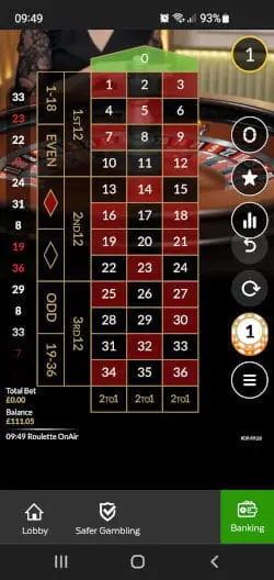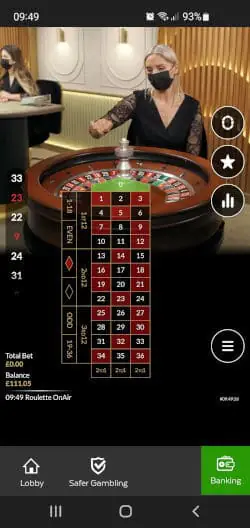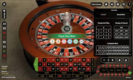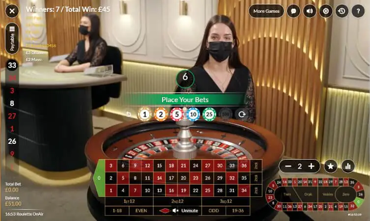 On Air Live Roulette is the European version of the game, played with a single zero.