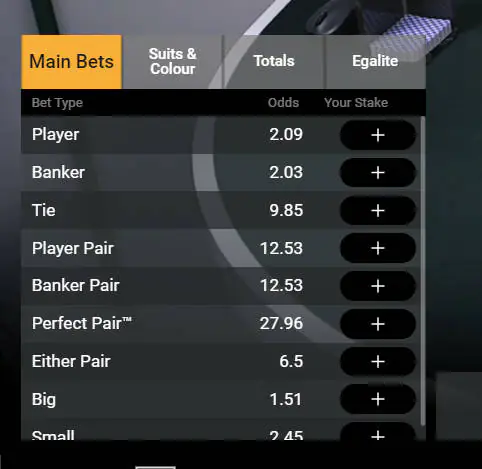In Playtech Bet on Baccarat, there are 33 different bets you can place. These cover the main hand bets, Suits and Colours, Totals, and Egalite bets. You can bet on multiple outcomes in addition to the standard baccarat side bets.
