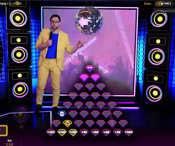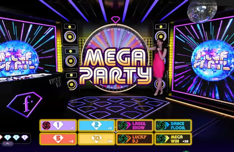 When the betting time closes and just before the Presenter spins the wheel, a randomly generated feature, "Mega Party," can be triggered. This feature boosts the payouts on all positions with multipliers.