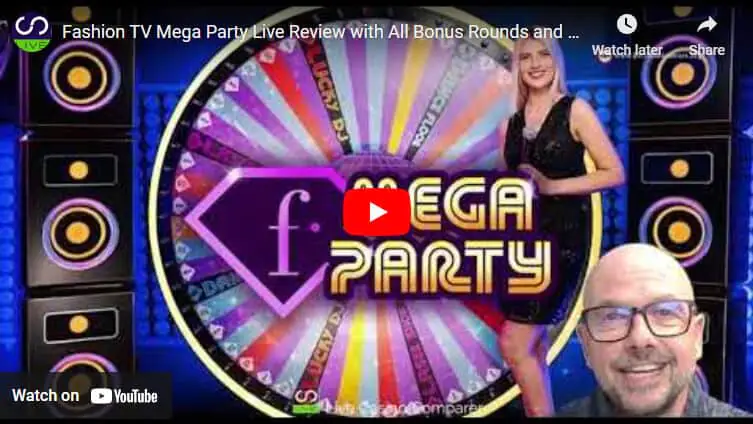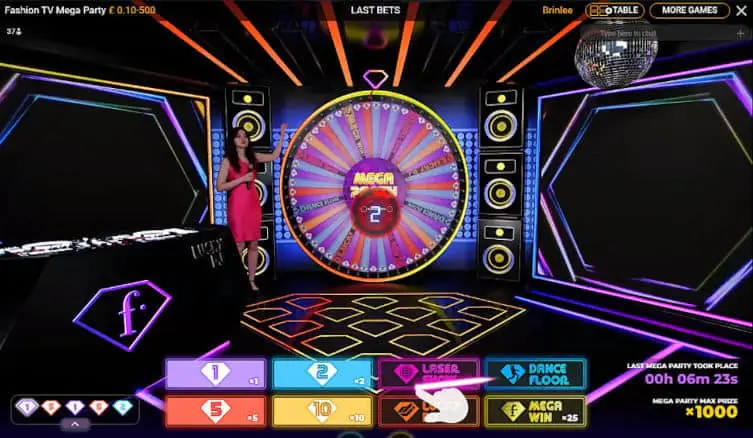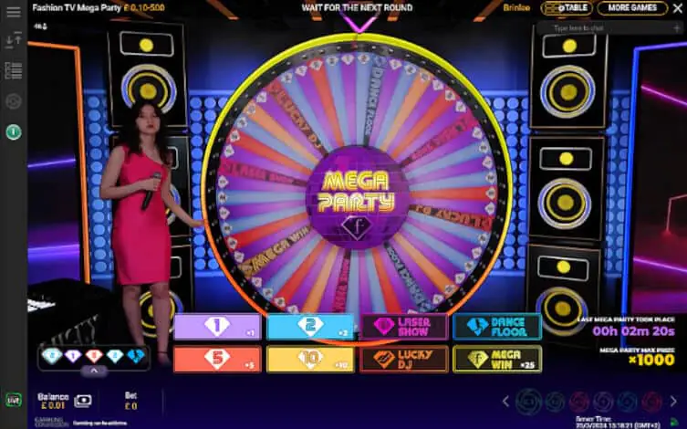 Fashion TV Mega Party Live is a Big wheel gameshow with instant wins and bonus rounds. A presenter controls the game and spins a 54-segment Big Wheel, which offers instant win prizes between 1x and 25x. The Three bonus rounds, Laser Show, Dance Floor, and Lucky DJ, can produce payouts of up to 120x.