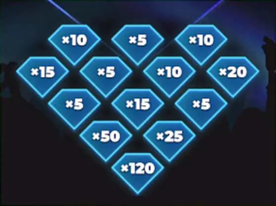 Each diamond is allocated a multiplier from 5x, 10x, 15x, 20x, 25x, 50x, and 120x.